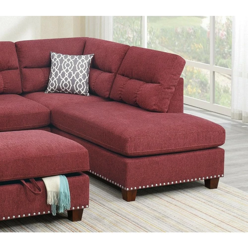 Enjoy a star-studded affair with this 3-piece reversible sectional sofa set covered in a comfortable velvety smooth fabric. Trimmed in a nickel finish stud around the base and rolled style arms. This tightly upholstered unit includes a reversible chaise, a cocktail storage ottoman, removable seat and back cushions, and two printed accent pillows.