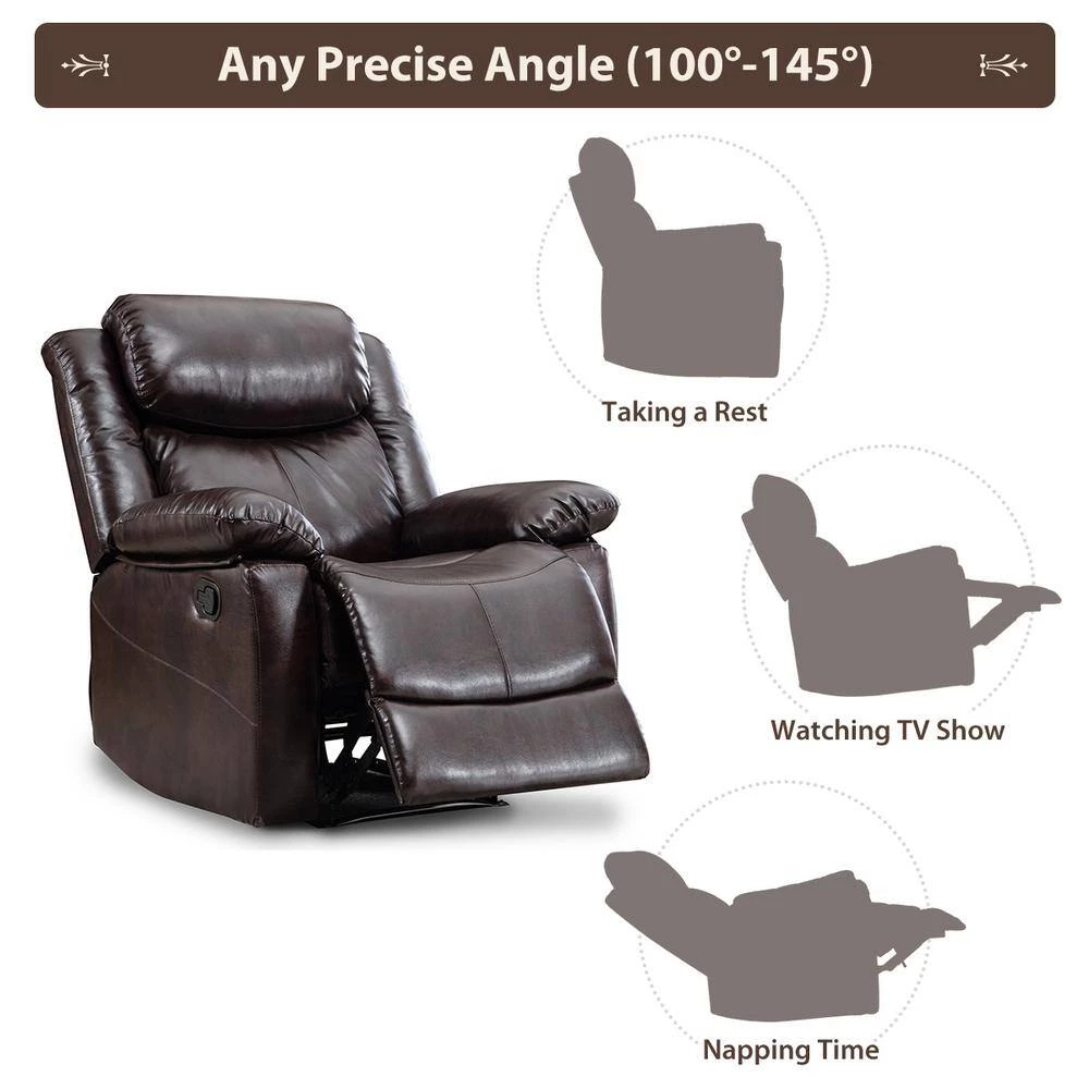 This contemporary recliner chair has been constructed on glued-solid sided wood frame and a reclining steel rail system for long lasting use. Padded seat cushions give more comfort and support where it’s needed the most. This model offers soft padding, excellent lumbar support and full chaise seating. With the simple reclining pull device, you can adjust the angle you want. Pull up the device under armrest and lean backwards using your body weight to recline the chair. it depends on what you want to do. Like reading a book, watching a movie, taking a nap, all you could adjust a suitable angle to enjoy.