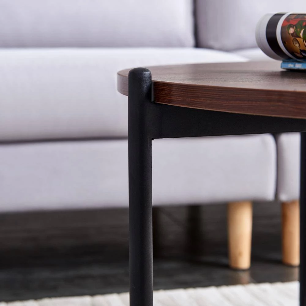 This is a round, wooden top and metal Coffee table. It is a modern and sleek design that will complement any living room. Functional round Coffee table to easily display decorative centerpieces plus storing magazines, beverages, or snacks while entertaining in the living room. The open base design gives you more space.