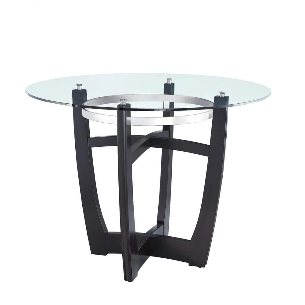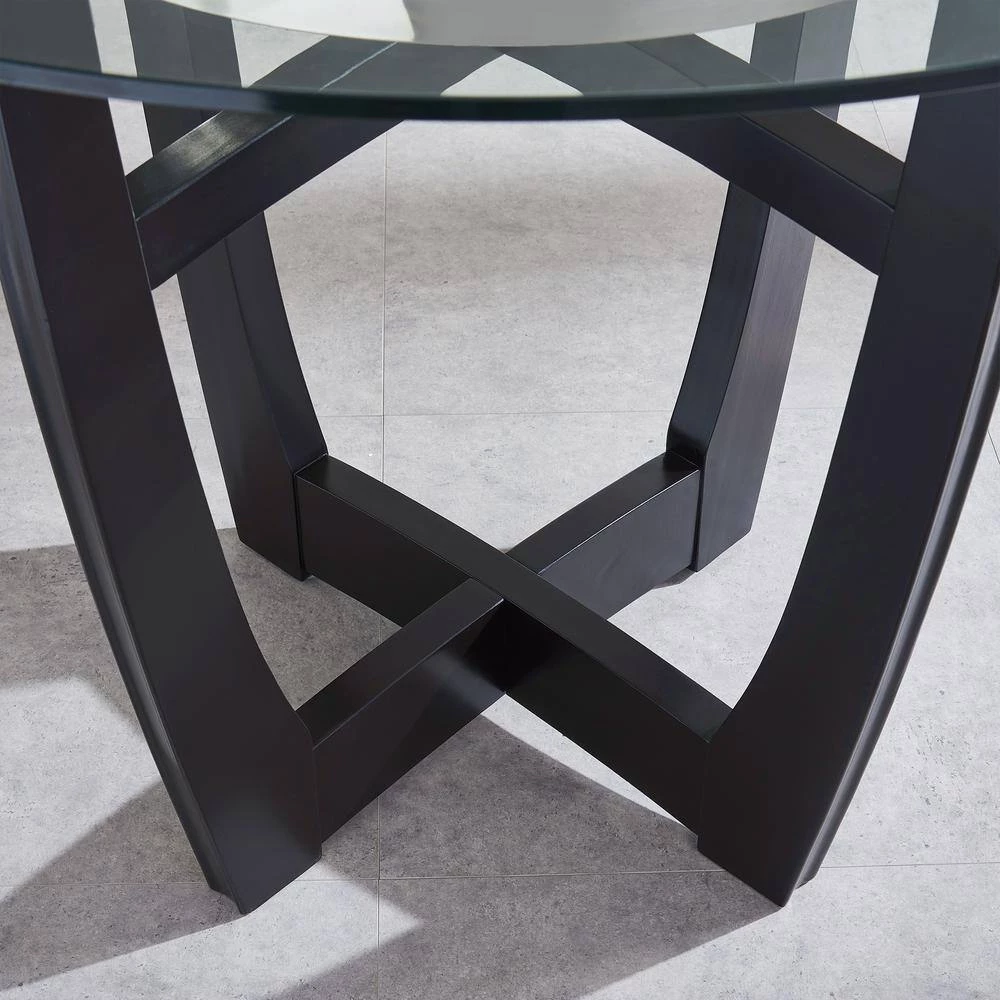 - Blending thought-provoking design and symmetrical style, this dining table lend mid-century modern appeal to any dining space. Its open-frame base showcases angular legs and around center support for a calming, balanced aesthetic. Its round tabletop comfortably accommodates up to four people.