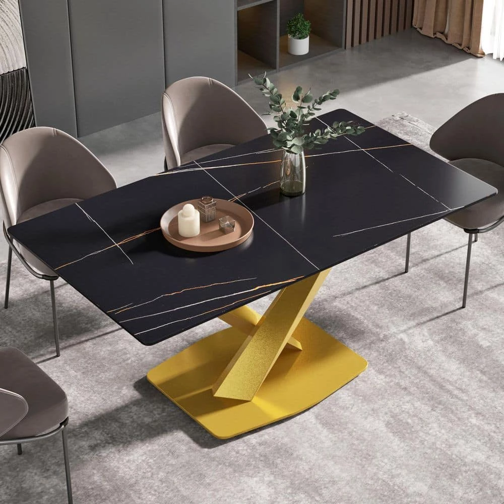 With a sintered stone that can resist 1280°, you don’t need to worry about any hot cooking which will damage the tabletop. Texture of tabletop looks simple but full of change. The black carbon steel legs not only hold the top in place and guarantee stability but also add to the visuals of this prudently designed dining table.And with enough seating for eight, this spacious table makes a show-stopping centerpiece for any gathering.