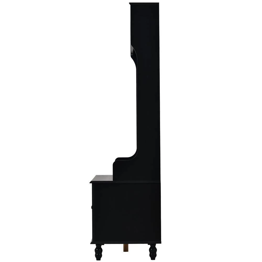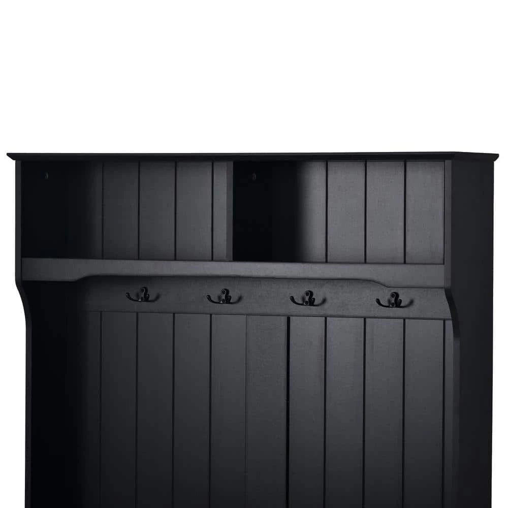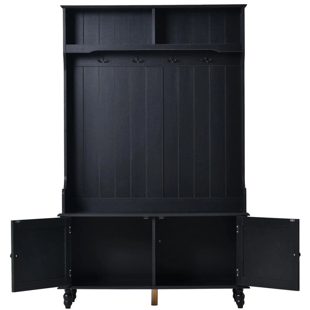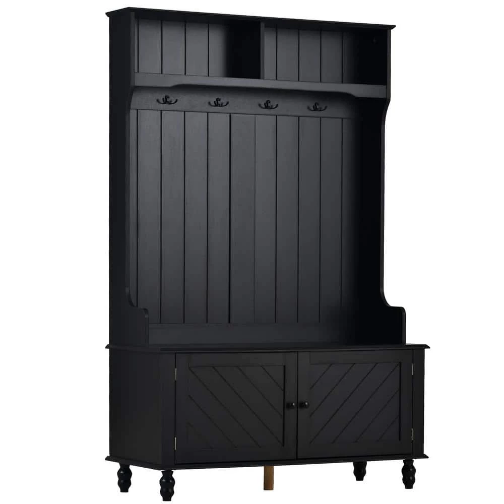 Perfect for the mudroom or a formal ensemble, this handsome hall tree features several storage solutions in a traditionally-designed package. Made from MDF wood, this dapper design features simple molding, elegantly turned feet and bead board paneling. Two cubby shelves are perfect for stowing away purses,books, or baskets of mail,while four double-sided brass hooks offer ample room for hanging jackets, scarves, hats and totes. Rounding out the design, a built-in storage bench includes a spacious cabinet for seasonal items like winter hats and mittens, or bench towels and picnic blankets.