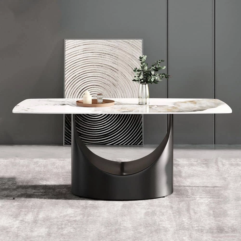 Each Family need a dining table. And this minimalist dining table we use 0.47 in. thick sintered stone, which can withstand 1200 degrees of high temperature. So even if the wine soup spilled on the table, don’t worry,just find a dry rag , you can easily wipe them up, and nothing will leave on the table.