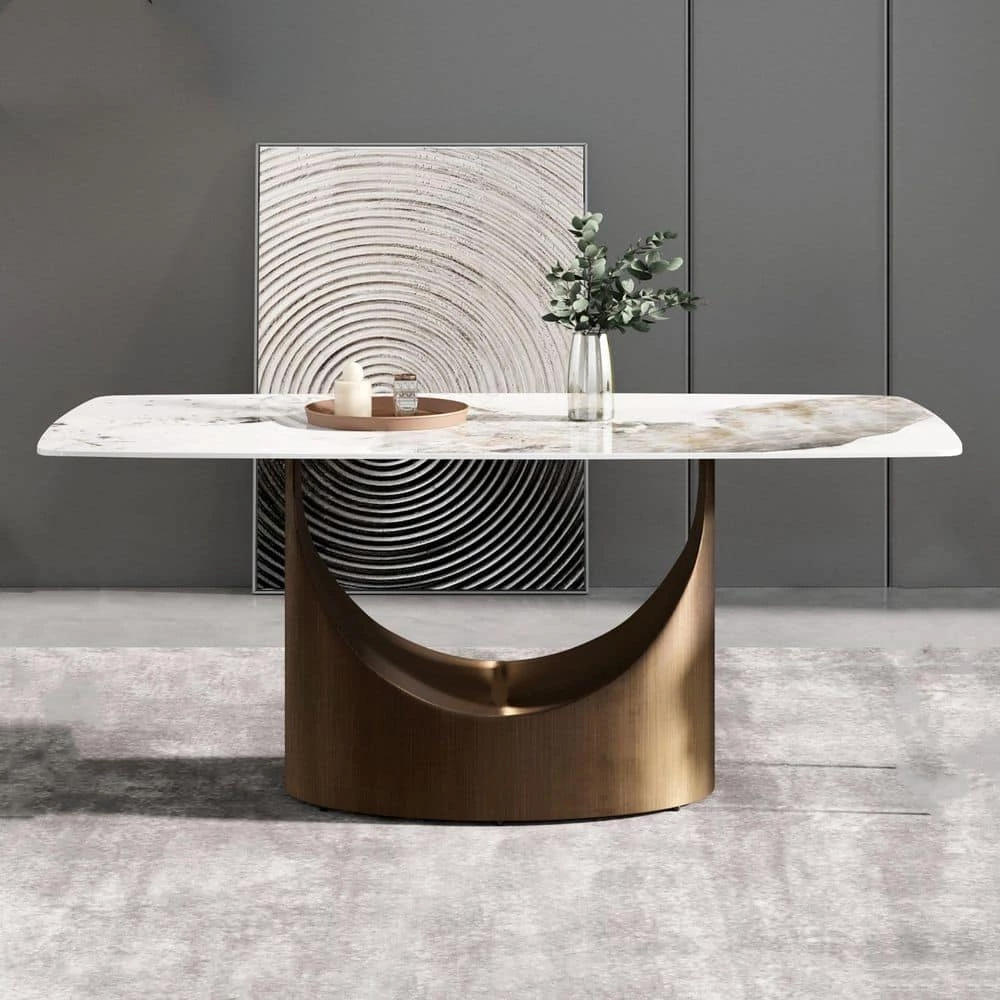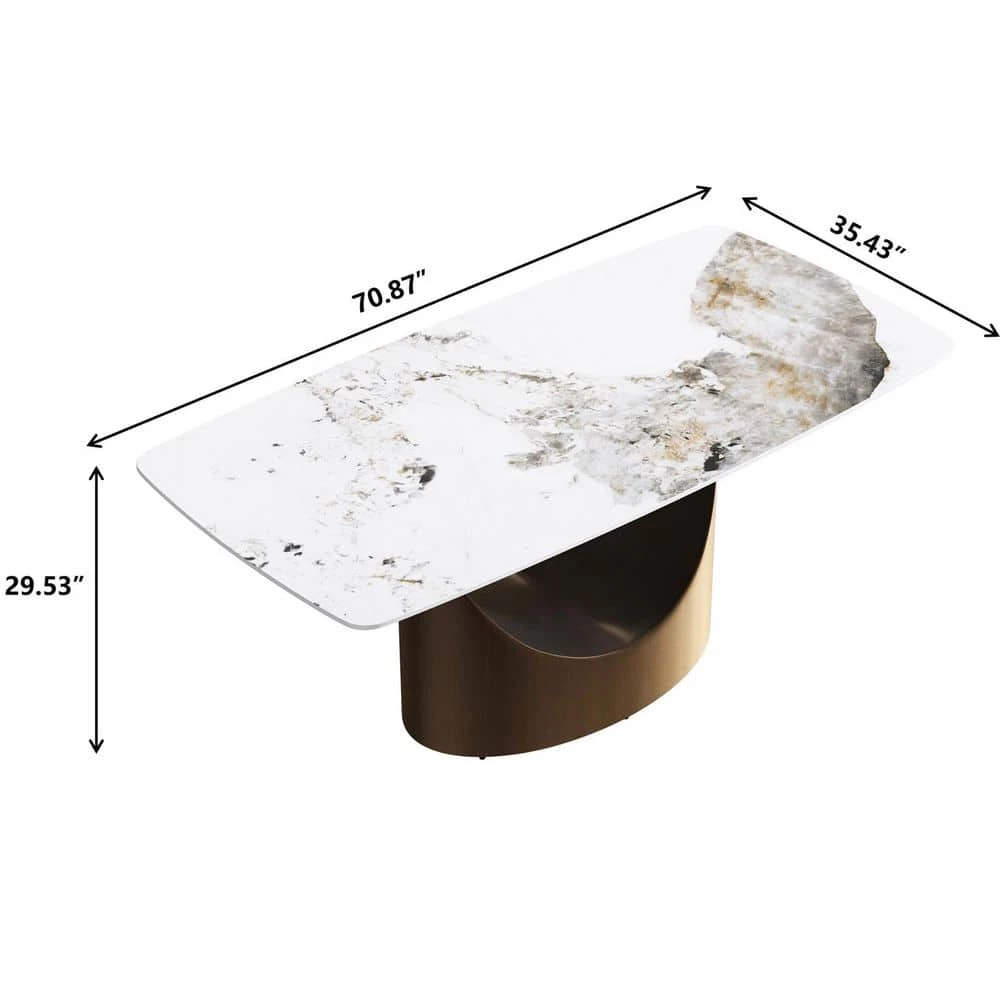 70.87 in. Round Edge Pandora Pattern Top Rectangle Sintered Stone Dining Table with Gold Carbon Pedestal Legs by Magic Home