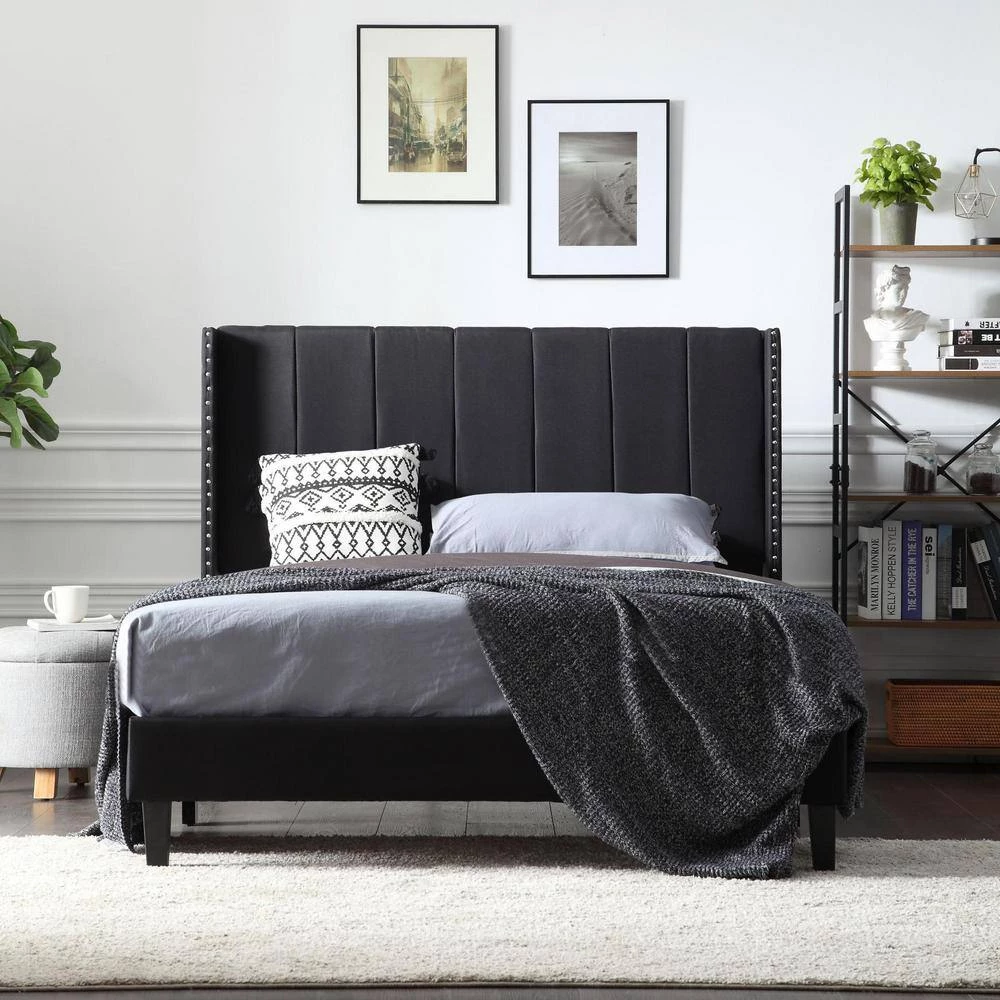 - Modern and Mid Century Design: Bed Frame with Wingback Headboard and Platform with Slats. Soft fabric covered