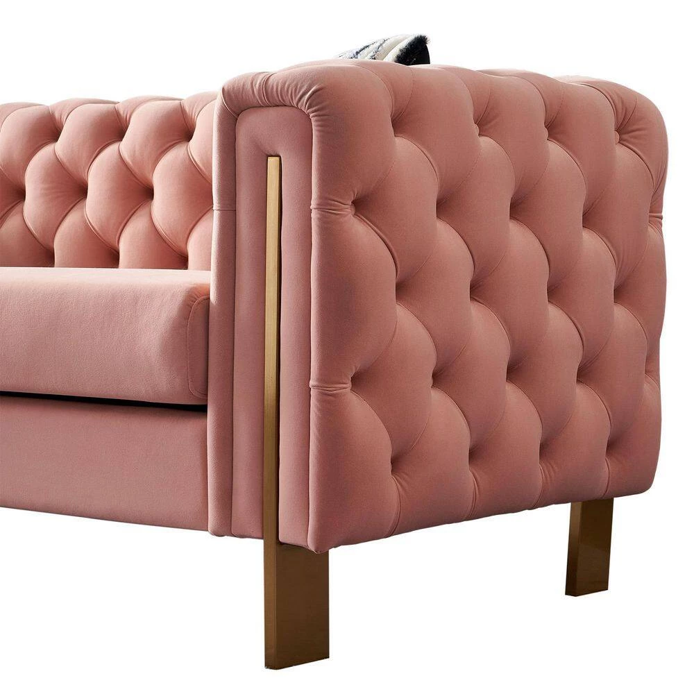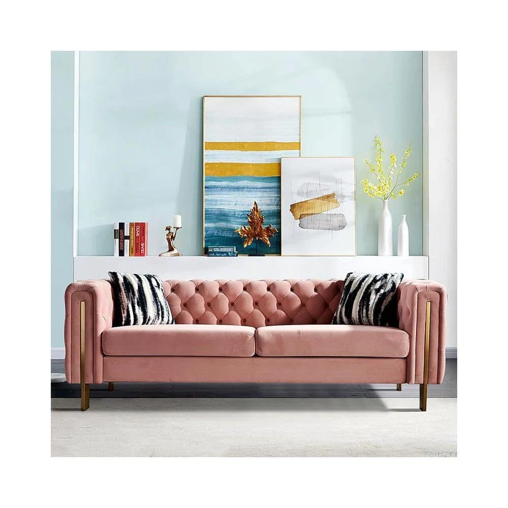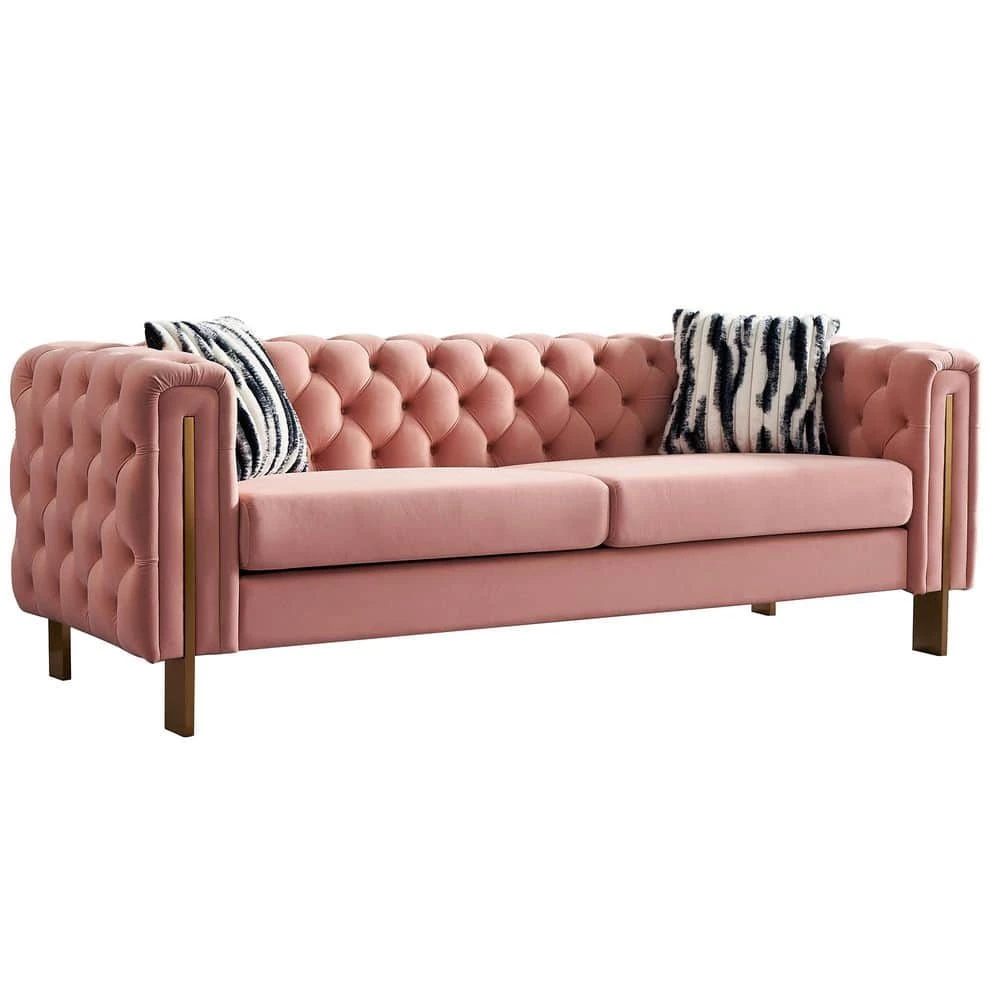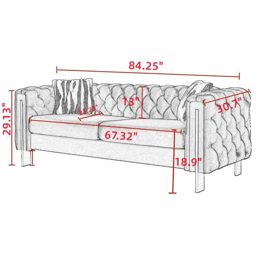 Center your living room around utmost sophistication and charming style with our exquisite sofa. This three-seater sofa offers your interior space eye-catching aesthetics with its deep tufted buttons and soft velvet upholstery, making this piece a perfect modern glam addition for any room. Finished with sleek metal legs, this piece not only secures your decor in refined elegance but it also provides incredible relaxation for all. From cozy movie night gatherings to casual conversations, our sofa will have you anchored in style.