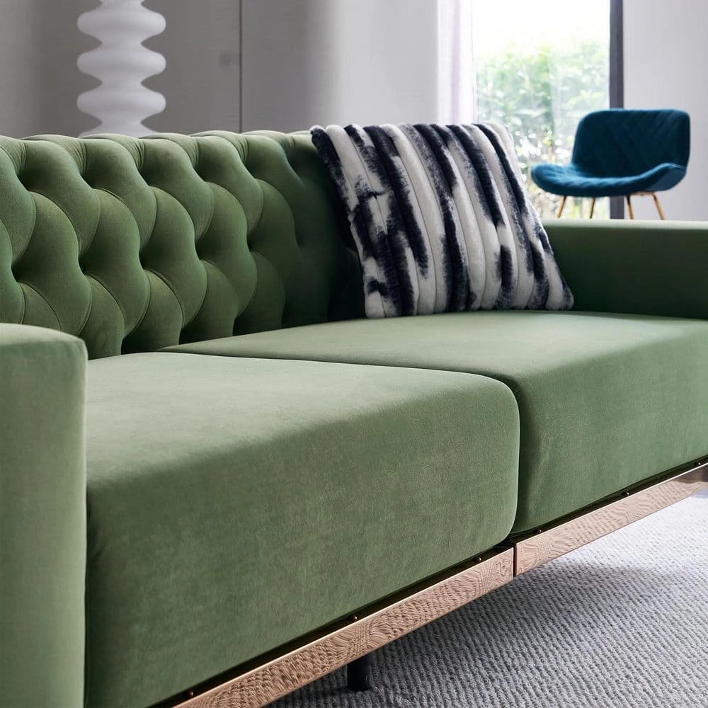 Center your living room around the utmost sophistication and charming style with our exquisite sofa. This three-seater sofa offers your interior space eye-catching aesthetics with its deep tufted buttons and soft velvet upholstery, making this piece a perfect modern glam addition to any room. Finished with sleek metal legs, this piece not only secures your decor in refined elegance but also provides incredible relaxation for all. From cozy movie night gatherings to casual conversations, our sofa will have you anchored in style.
