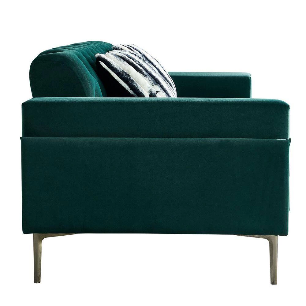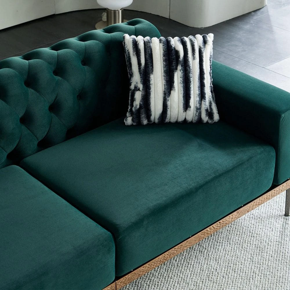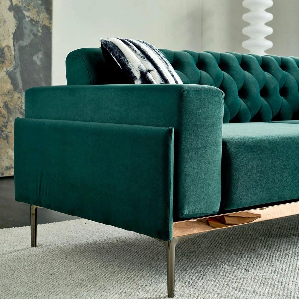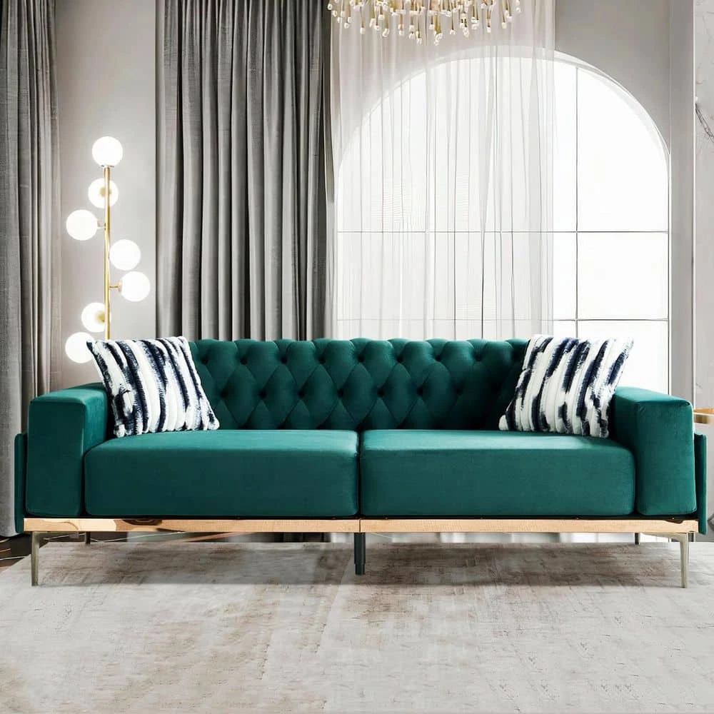Center your living room around utmost sophistication and charming style with our exquisite sofa. This three-seater sofa offers your interior space eye-catching aesthetics with its deep tufted buttons and soft velvet upholstery, making this piece a perfect modern glam addition for any room. Finished with sleek metal legs, this piece not only secures your decor in refined elegance but it also provides incredible relaxation for all. From cozy movie night gatherings to casual conversations, our sofa will have you anchored in style.