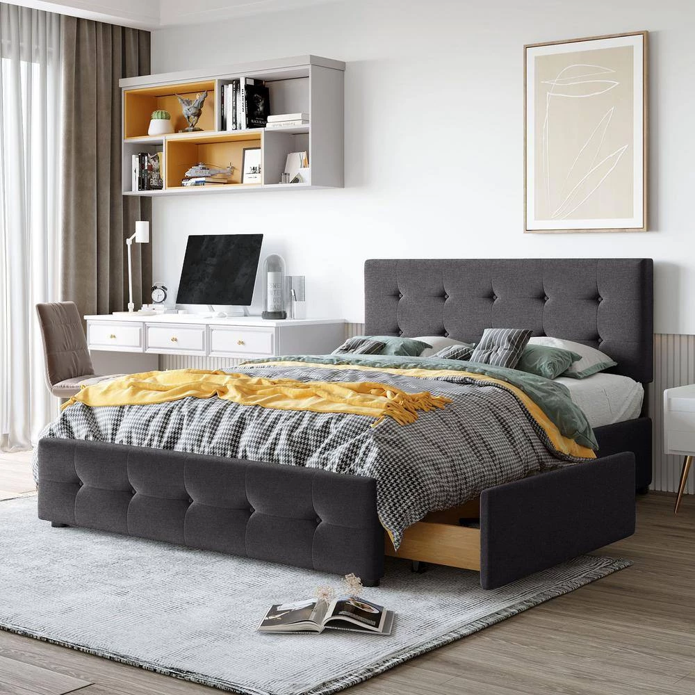 This beautiful Upholstered Platform Bed features button tufted upholstered headboard that adds a contemporary chic look to your bedroom and filled in thick foam to add extra comfort. Sturdy wood frame construction and a wooden slat system to add extra stability and safety. Despite its size and solidity, this piece comes with hardware and instructions included and anyone can assemble it, without a problem. The upholstered platform bed with four drawers can easily be pulled in and out for maximum storage space, perfect for organizing anything from clothes and bed linens to toys and games.