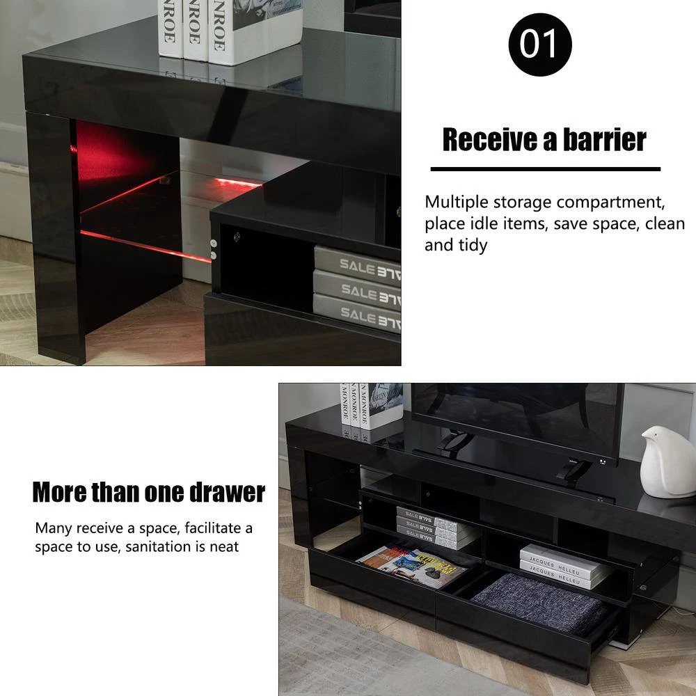 More Space to use. This white TV Stand provides Multiple storage compartments to allow more space can be used. Just buy it and make your home more organized. Spacious storage drawers . Entertainment central features 2-large drawers, which provide plenty of ample storage space for your gaming consoles. Easy to pull and durable to use. Glass open shelf design. Open shelf design of this TV Stand makes is easily to storage your books or other decorations. High gloss smooth surface, all sides in the same color and finished in white, easy to clean. LED RGB lights system. Glass panels are fitted with adjustable lights. LED lights system with switch ON/OFF and red color led light. Make your home more elegant and beautiful. Wide range of applications. You can place this modern white TV stand in your lounge room, living room, bedroom and more places. This TV cabinet for flat screens fits in well with most home decors, it is ideal for using in living rooms to hold TV and some decorations such as vases and photos at the tops.