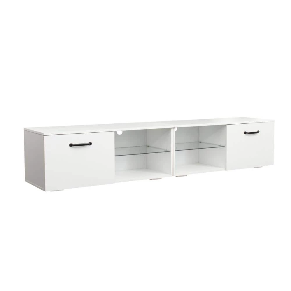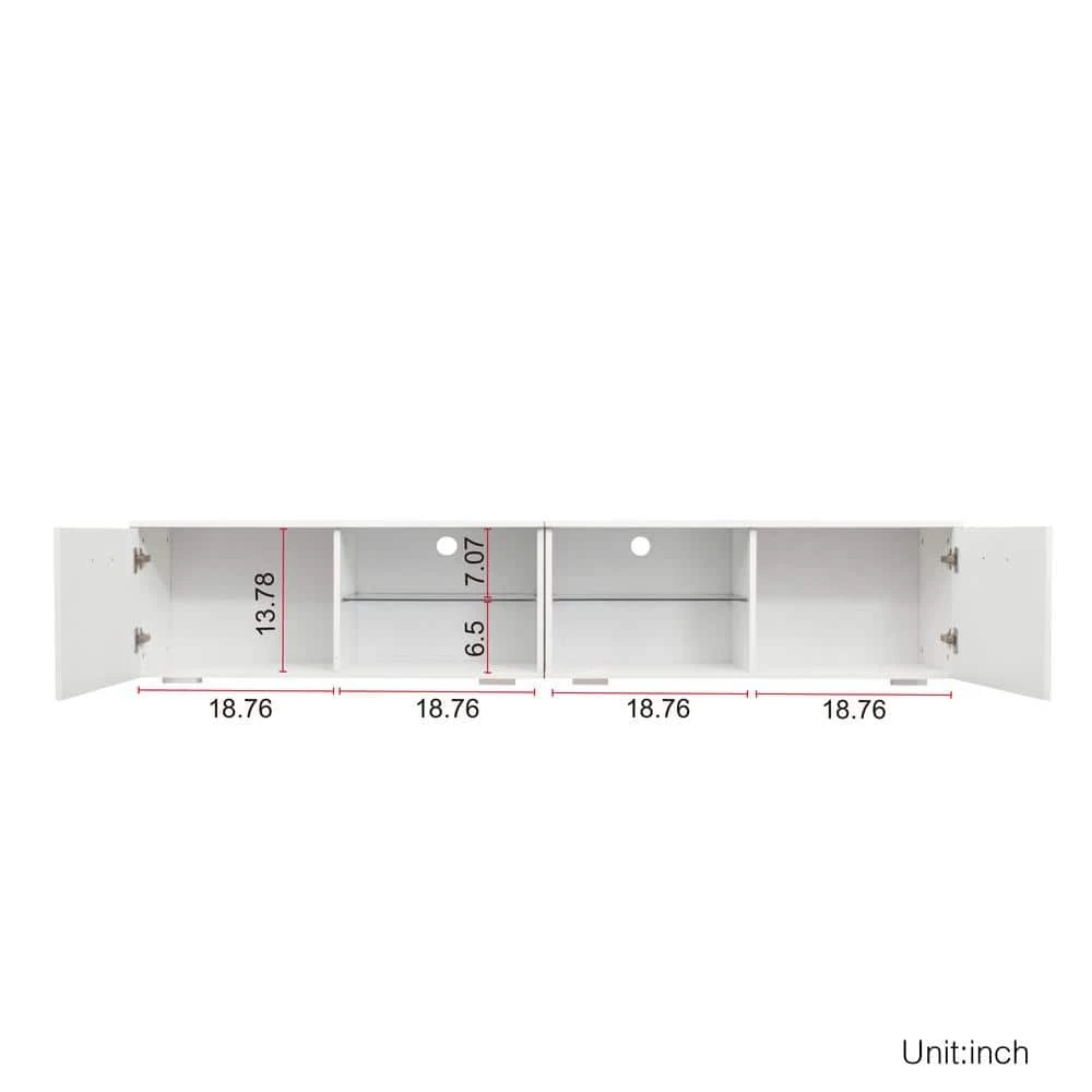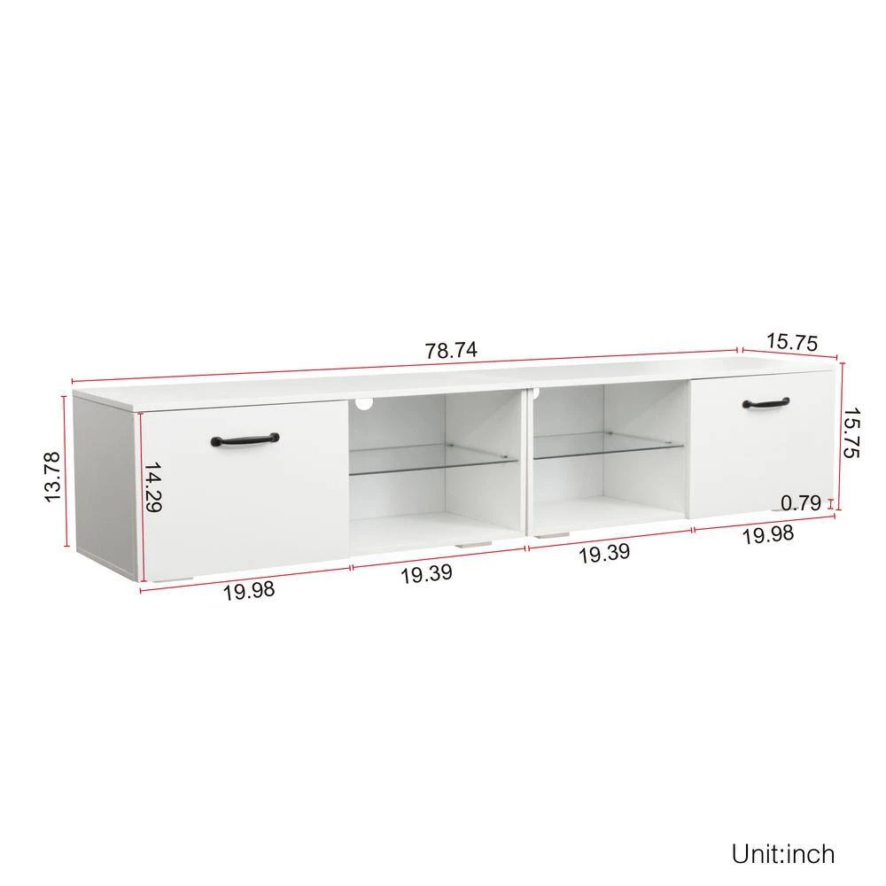 The TV stands good for up to 80″ TV. Floating entertainment center Walls,With LED lights, 2 kinds of color change. This product is easy to assemble.