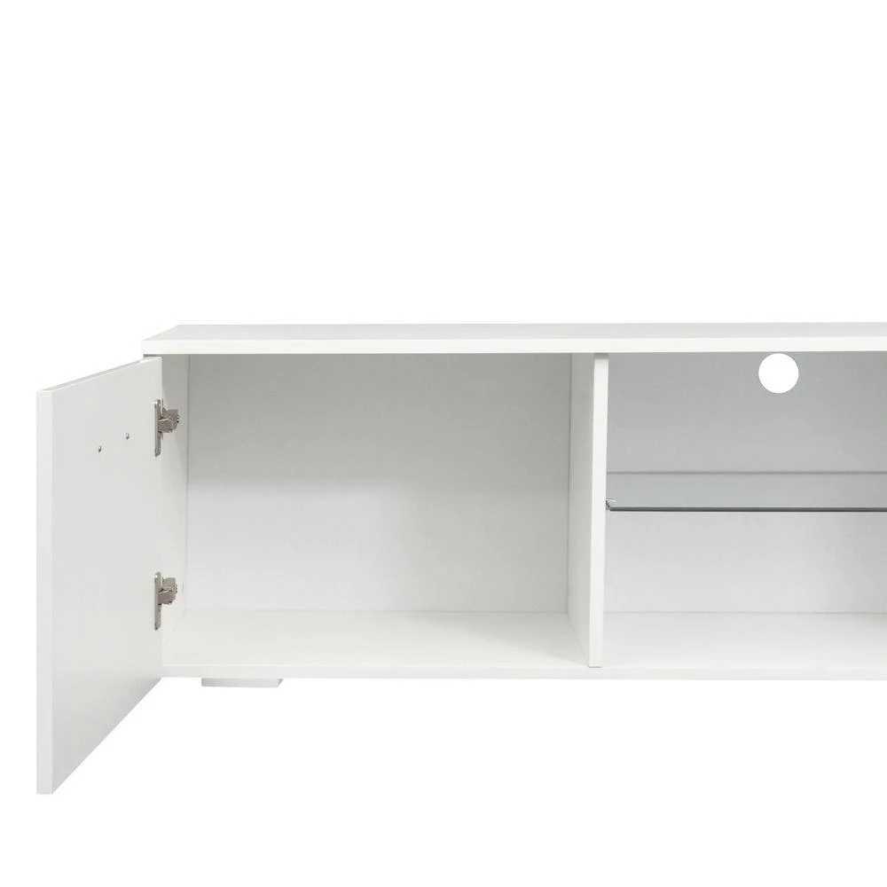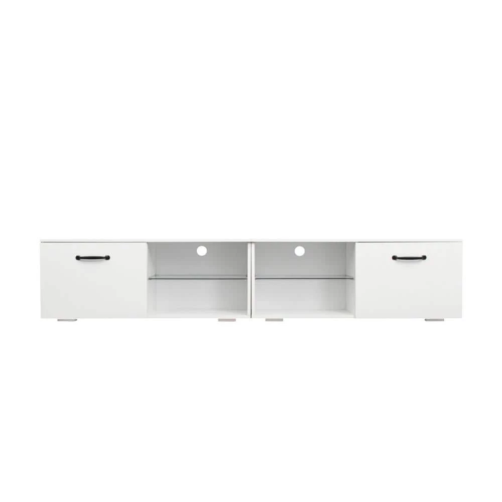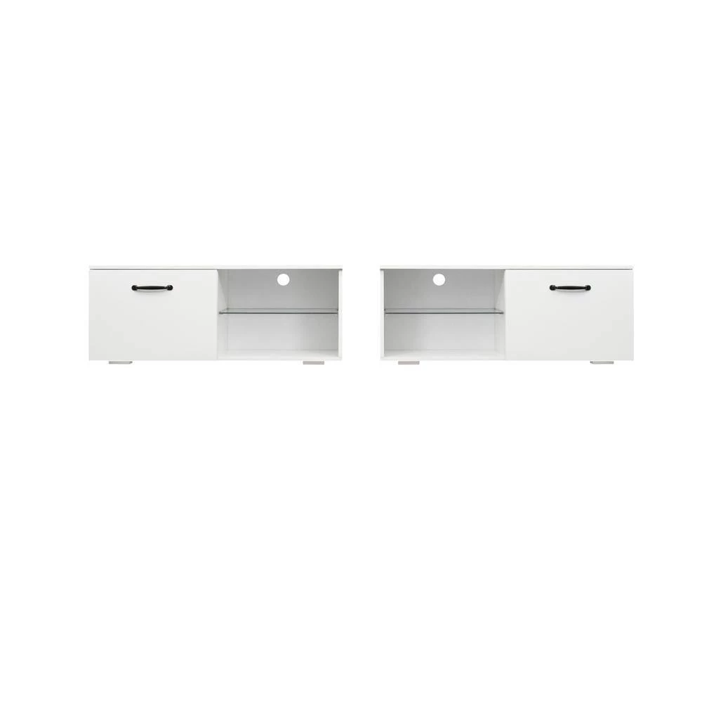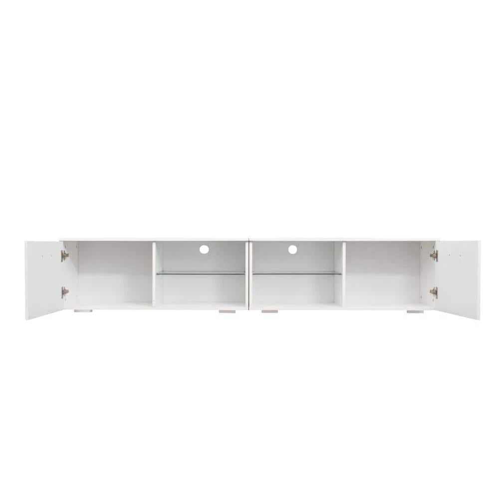 The TV stands good for up to 80″ TV. Floating entertainment center Walls,With LED lights, 2 kinds of color change. This product is easy to assemble.